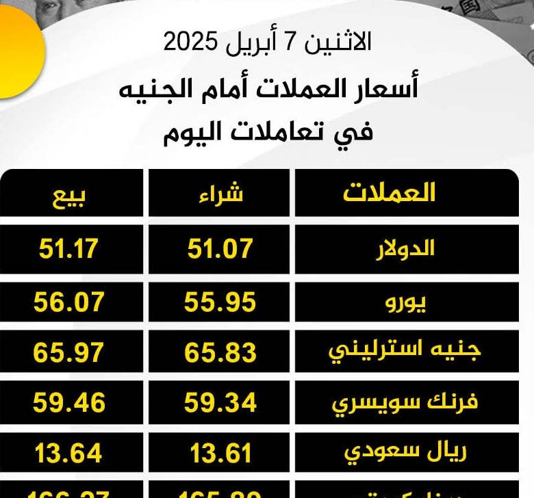 أسعار العملات أمام الجنيه في تعاملات اليوم الاثنين 7 أبريل 2025