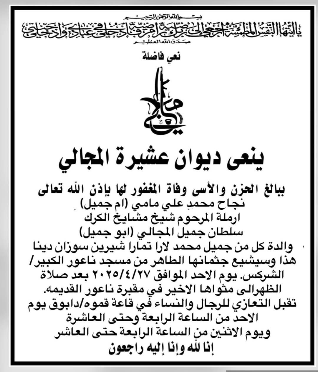 للشيخة لارا سلطان المجالى فى وفاة السيدة والداتها / نجاح