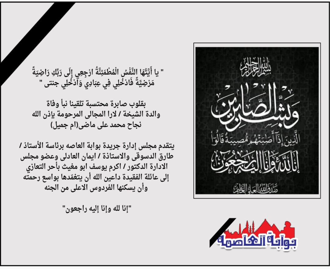 يتقدم مجلس إدارة جريدة بوابة العاصه برئاسة الأستاذ / طارق الدسوقى والاستاذة / ايمان العادلى وعضو مجلس الادارة الدكتور / اكرم يوسف ابو مغيث بأحر التعازي