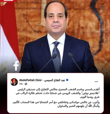 الرئيس السيسي يعزي نظيره “فلاديمير بوتين” والشعب الروسي في ضحايا حادث تحطم طائرة الركاب في شرق روسيا اليوم