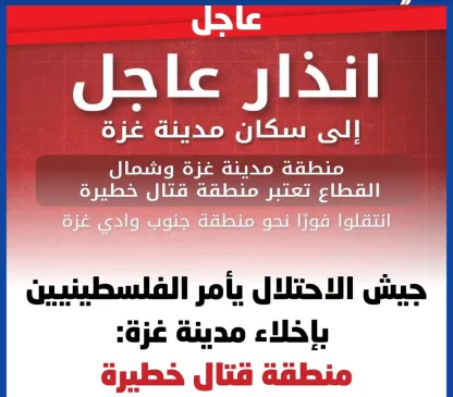 جيش الاحتلال يأمر الفلسطينيين بإخلاء مدينة