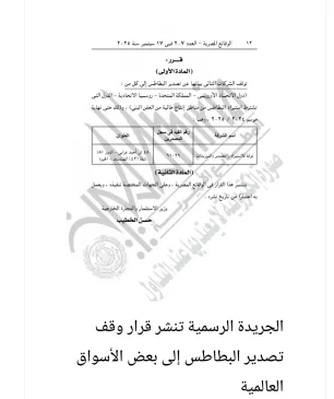 نشرت الجريدة الرسمية القرار رقم 334 لعام 2025 الصادر عن وزارة الاستثمار والتجارة الخارجية، والذي يقضي بوقف تصدير بعض الشركات للبطاطس إلى دول الاتحاد الأوروبي والمملكة المتحدة وروسيا، إضافة إلى الدول التي تشترط استيراد البطاطس من مناطق خالية من العفن البني.