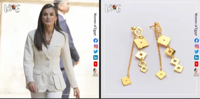 وأكملت الملكة إطلالتها بحلق بأشكال هندسية من ورشة “ميشكا” في القاهرة، التي توظف نحو ستين امرأة وتدمج بين صناعة المجوهرات والأعمال الجلدية. تأتى هذه الورشة ضمن مشروع التعاون الإسباني الذي يسعى لتوفير التدريب وفرص العمل للنساء في مدينة الموتى، وتعزيز دور المرأة والمساواة، ودعم المجتمع المحلي، والحفاظ على التراث الثقافي