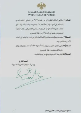 ويحمل المرسوم رقم 188 لعام 2025 ويقضي بتحديد الأعياد الرسمية والأيام التي يستفيد العاملون الخاضعون لأحكام القانون الأساسي للعاملين في الدولة من عطلة فيها بأجر كامل