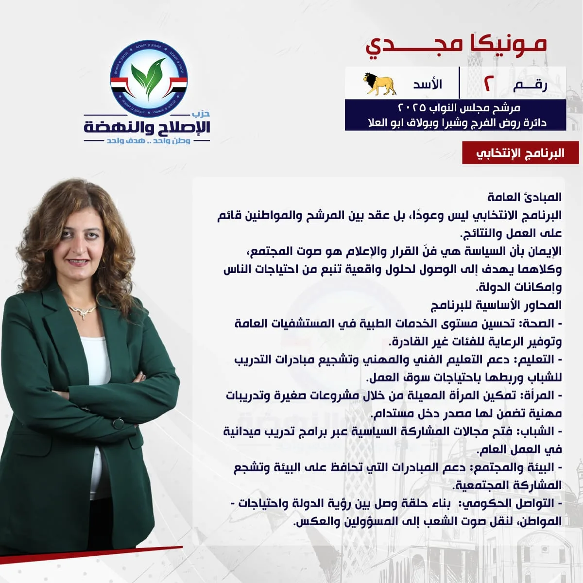 البرنامج الانتخابي لمونيكا مجدي مرشحة النواب عن دائرة روض الفرج وشبرا وبولاق أبو العلا