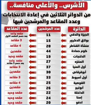 الأشرس.. والأعلى منافسة.. من الدوائر الثلاثين في إعادة الانتخابات وعدد المقاعد والمرشحين فيها