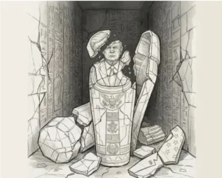 وبحسب الرسم المرفق بالتغريدة، فقد كان هناك تابوت فرعوني يتضمن رسما لترامب داخل غرفة أشبه بمقبرة فرعونية، وكان التابوت محطما وحوله بعض الحجارة المحطمة أيضا، والتي تحمل شعارات وأعلام أميركية.