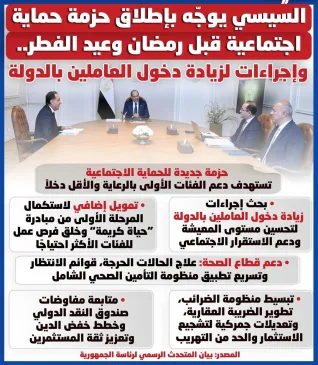 السيسي يوجّه بإطلاق حزمة حماية اجتماعية قبل رمضان وعيد الفطر.. وإجراءات لزيادة دخول العاملين بالدولة