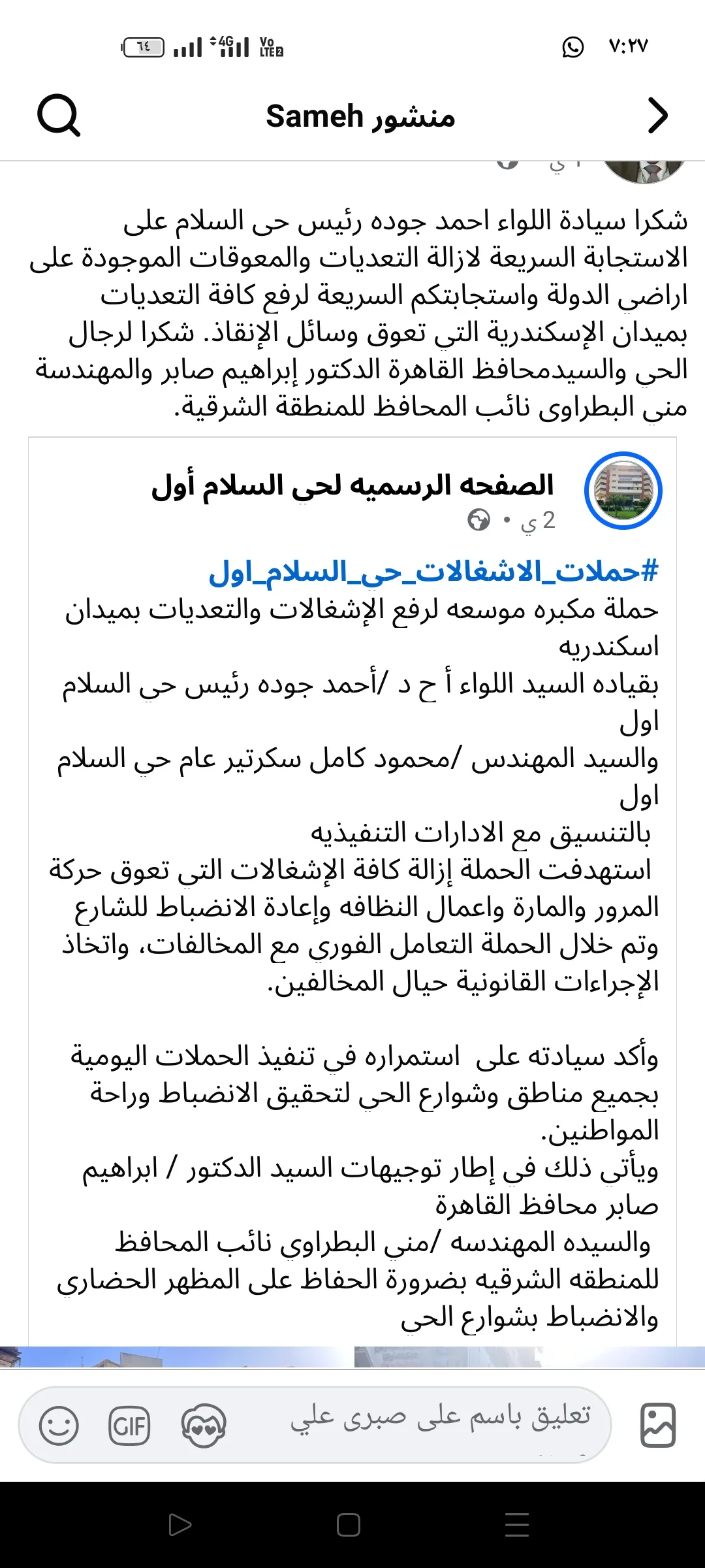 رصدنا رسائل شكر من أهل حى السلام اول للواء اركان حرب احمد جواد رئيس حى السلام اول على صفحاتهم الخاصة وصفحات التواصل الاجتماعي للحى أثناء حملة مكبره موسعه لرفع الإشغالات والتعديات بميدان اسكندريه