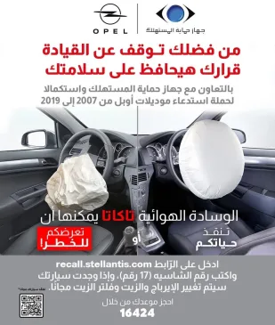 📌لوجود عيب تصنيعي بالوسائد الهوائية تاكاتا يُشكل خطورة على قائدي السيارات وبالتنسيق مع جهاز حماية المستهلك.. شركة المنصور للسيارات وكيل العلامة التجارية أوبل OPEL العالمية، تُعلن عن استدعاء للسيارات “أوبل” من إنتاج 2007 وحتى إنتاج 2019