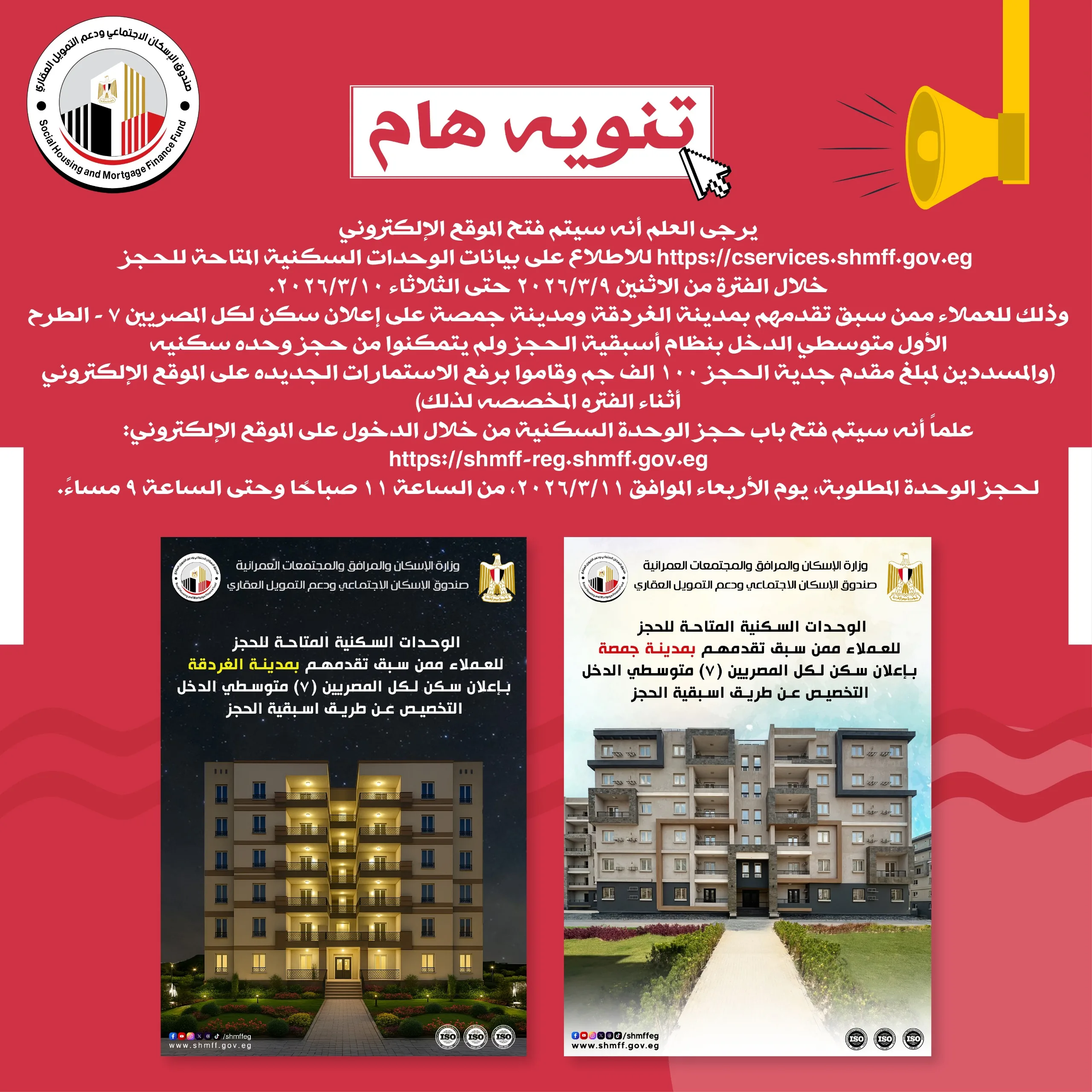 https://cservices.shmff.gov.eg للاطلاع على بيانات الوحدات السكنية المتاحة للحجز خلال الفترة من الاثنين 9/3/2026 حتى الثلاثاء 10/3/2026.