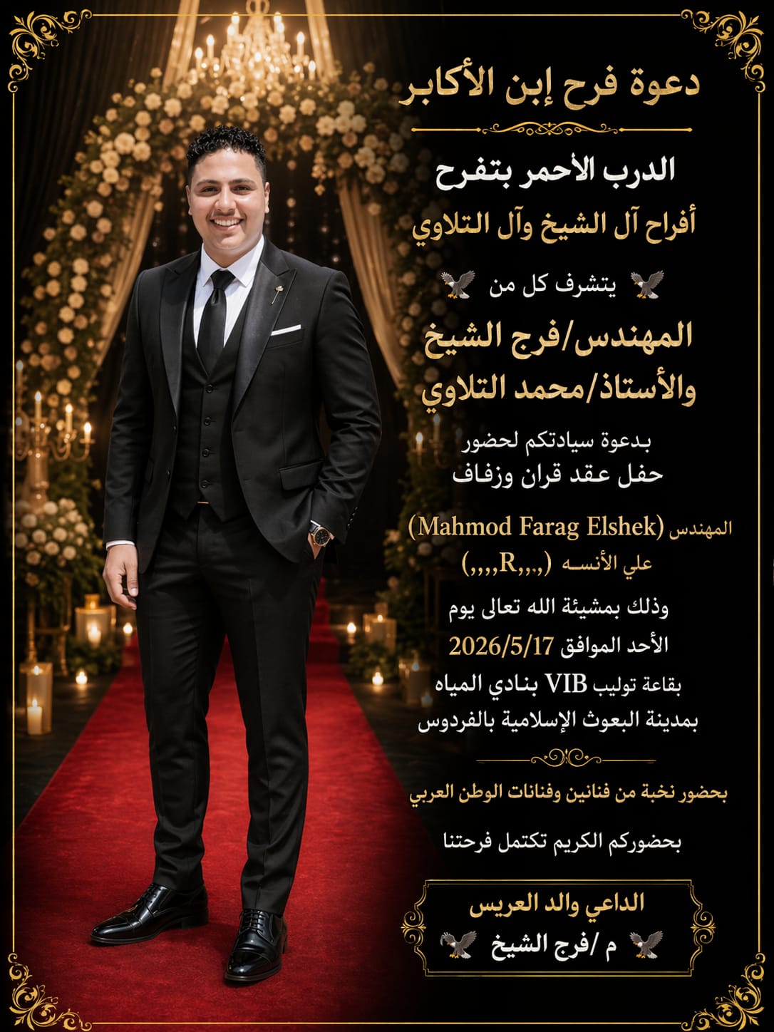 تهنئ جريدة ومجلة ومؤسسة بوابة العاصمة الإعلامية المهندس فرج الشيخ بعقد قران وزفاف نجله المهندس محمود فرج الشيخ علي الآنسة ( R ) الحفل المقيم بقاعة توليب VIB. بنادى المياه بمدينة البعوث الإسلامية بالفردوس حى الوايلى القاهرة